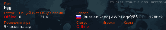 Играет на Counter Strike Global Offensive сервере. Страна: РоссияПервый раз замечен 19:22 02.03.2026