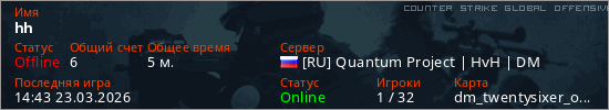 Играет на Counter Strike Global Offensive сервере. Страна: РоссияПервый раз замечен 14:41 23.03.2026