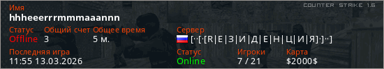 Играет на Counter Strike 1.6 сервере. Страна: РоссияПервый раз замечен 11:46 13.03.2026
