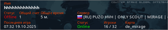 Играет на Counter Strike Global Offensive сервере. Страна: РоссияПервый раз замечен 07:14 19.10.2025