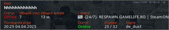 Играет на Counter Strike 1.6 сервере. Страна: СШАПервый раз замечен 04:08 07.03.2025