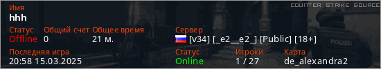 Играет на Counter Strike Source сервере. Страна: РоссияПервый раз замечен 16:38 14.03.2025