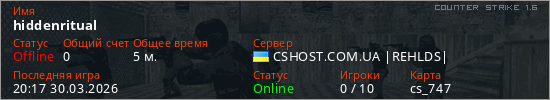 Играет на Counter Strike 1.6 сервере. Страна: УкраинаПервый раз замечен 19:50 30.03.2026