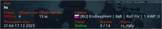 Играет на Counter Strike Global Offensive сервере. Страна: РоссияПервый раз замечен 18:27 17.12.2025