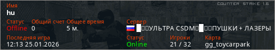 Играет на Counter Strike 1.6 сервере. Страна: РоссияПервый раз замечен 12:01 25.01.2026