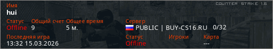 Играет на Counter Strike 1.6 сервере. Страна: РоссияПервый раз замечен 13:21 15.03.2026