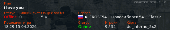 Играет на Counter Strike 1.6 сервере. Страна: РоссияПервый раз замечен 18:27 15.04.2026