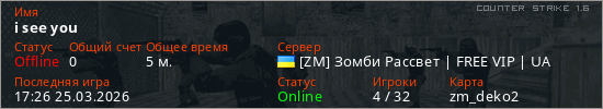Играет на Counter Strike 1.6 сервере. Страна: УкраинаПервый раз замечен 17:24 25.03.2026
