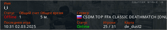 Играет на Counter Strike 1.6 сервере. Страна: РоссияПервый раз замечен 09:50 02.03.2025