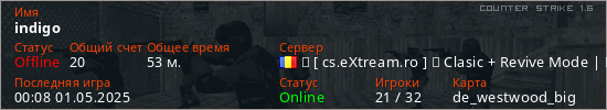 Играет на Counter Strike 1.6 сервере. Страна: РумынияПервый раз замечен 18:23 30.10.2024