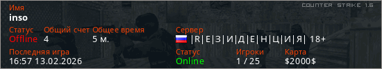 Играет на Counter Strike 1.6 сервере. Страна: РоссияПервый раз замечен 16:53 13.02.2026