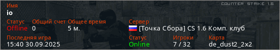 Играет на Counter Strike 1.6 сервере. Страна: РоссияПервый раз замечен 15:38 30.09.2025