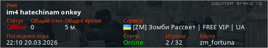 Играет на Counter Strike 1.6 сервере. Страна: УкраинаПервый раз замечен 22:02 20.03.2026