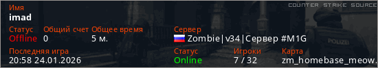 Играет на Counter Strike Source сервере. Страна: РоссияПервый раз замечен 20:49 24.01.2026