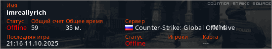 Играет на Counter Strike Source сервере. Страна: РоссияПервый раз замечен 21:58 30.09.2025
