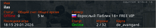 Играет на Counter Strike 1.6 сервере. Страна: РоссияПервый раз замечен 18:04 29.01.2026