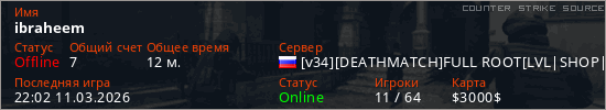 Играет на Counter Strike Source сервере. Страна: РоссияПервый раз замечен 21:56 11.03.2026