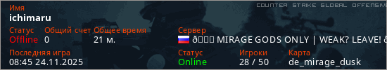 Играет на Counter Strike Global Offensive сервере. Страна: РоссияПервый раз замечен 08:15 24.11.2025