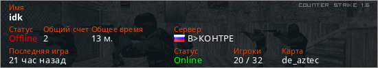 Играет на Counter Strike 1.6 сервере. Страна: РоссияПервый раз замечен 01:40 13.04.2026