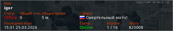 Играет на Counter Strike 1.6 сервере. Страна: РоссияПервый раз замечен 15:29 25.03.2026