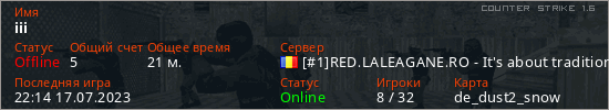 Играет на Counter Strike 1.6 сервере. Страна: РумынияПервый раз замечен 18:25 13.05.2023