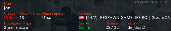 Играет на Counter Strike 1.6 сервере. Страна: СШАПервый раз замечен 14:14 25.02.2025