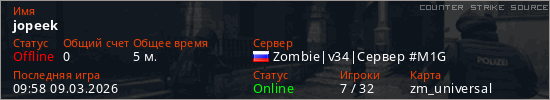 Играет на Counter Strike Source сервере. Страна: РоссияПервый раз замечен 09:54 09.03.2026