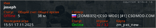 Играет на Counter Strike 1.6 сервере. Страна: РоссияПервый раз замечен 12:15 24.09.2025
