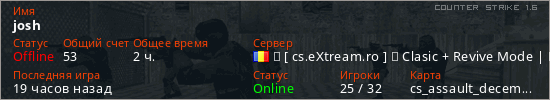 Играет на Counter Strike 1.6 сервере. Страна: РумынияПервый раз замечен 20:05 21.01.2025