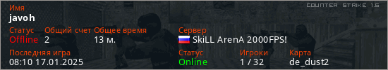 Последний раз был в сети 08:10 17.01.2025 Игрок с таким ником замечен на 12 серверах