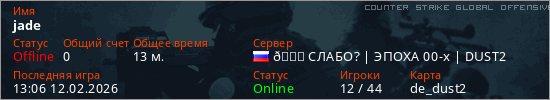 Играет на Counter Strike Global Offensive сервере. Страна: РоссияПервый раз замечен 11:32 10.02.2026