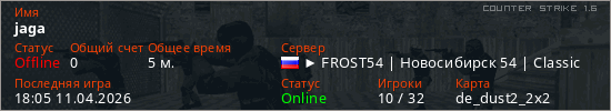 Играет на Counter Strike 1.6 сервере. Страна: РоссияПервый раз замечен 18:03 11.04.2026