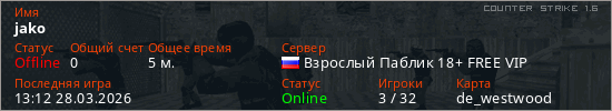 Играет на Counter Strike 1.6 сервере. Страна: РоссияПервый раз замечен 13:01 28.03.2026