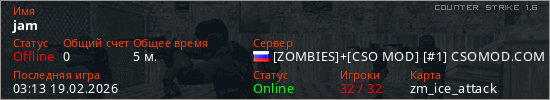 Играет на Counter Strike 1.6 сервере. Страна: РоссияПервый раз замечен 03:09 19.02.2026