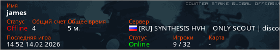 Играет на Counter Strike Global Offensive сервере. Страна: РоссияПервый раз замечен 14:46 14.02.2026