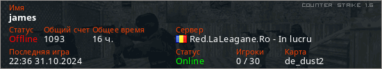 Играет на Counter Strike 1.6 сервере. Страна: РумынияПервый раз замечен 22:36 04.09.2022