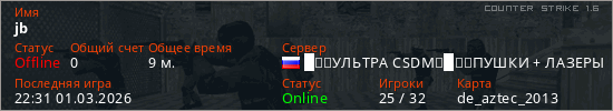 Играет на Counter Strike 1.6 сервере. Страна: РоссияПервый раз замечен 17:58 26.02.2026