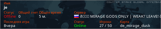 Играет на Counter Strike Global Offensive сервере. Страна: РоссияПервый раз замечен 19:19 13.01.2026