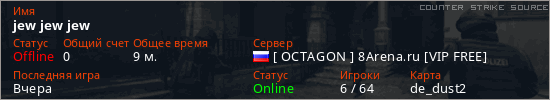 Играет на Counter Strike Source сервере. Страна: РоссияПервый раз замечен 17:06 03.04.2026