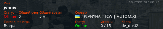 Играет на Counter Strike 1.6 сервере. Страна: УкраинаПервый раз замечен 02:04 29.03.2026