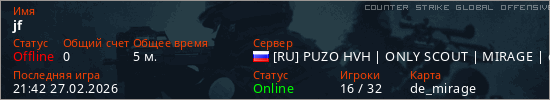 Играет на Counter Strike Global Offensive сервере. Страна: РоссияПервый раз замечен 21:31 27.02.2026