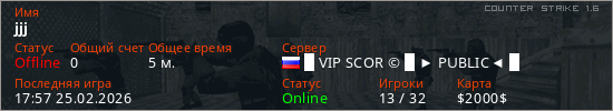 Играет на Counter Strike 1.6 сервере. Страна: РоссияПервый раз замечен 17:49 25.02.2026
