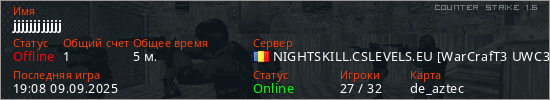 Играет на Counter Strike 1.6 сервере. Страна: РумынияПервый раз замечен 18:55 09.09.2025