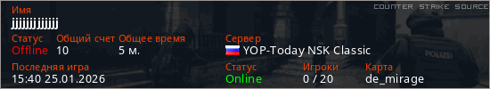 Играет на Counter Strike Source сервере. Страна: РоссияПервый раз замечен 15:38 25.01.2026
