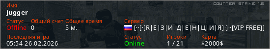 Играет на Counter Strike 1.6 сервере. Страна: РоссияПервый раз замечен 05:52 26.02.2026