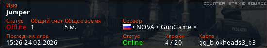 Играет на Counter Strike Source сервере. Страна: РоссияПервый раз замечен 15:21 24.02.2026