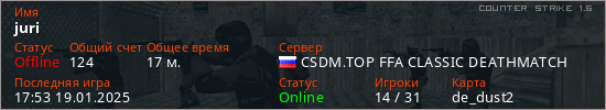Играет на Counter Strike 1.6 сервере. Страна: РоссияПервый раз замечен 17:41 19.01.2025