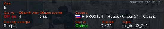 Играет на Counter Strike 1.6 сервере. Страна: РоссияПервый раз замечен 15:35 09.04.2026