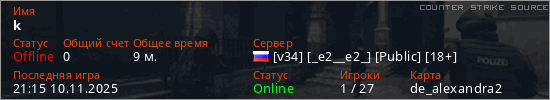 Играет на Counter Strike Source сервере. Страна: РоссияПервый раз замечен 21:07 10.11.2025