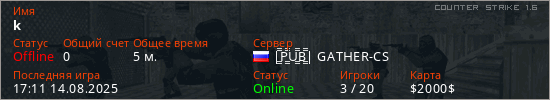 Играет на Counter Strike 1.6 сервере. Страна: РоссияПервый раз замечен 16:55 14.08.2025